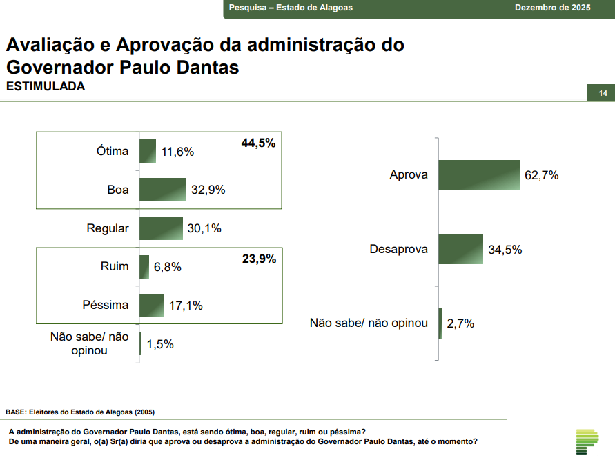 Quando o assunto é a gestão do governador Paulo Dantas, 62,7% dos entrevistados aprovam e 34,5% desaprovam.