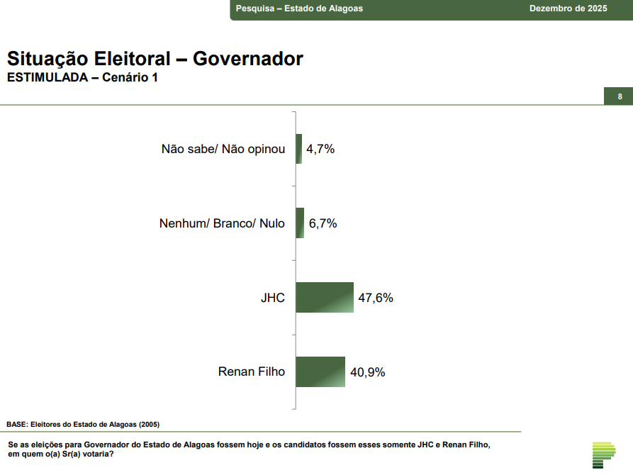 O Instituto Paraná divulgou nesta sexta-feira (12) pesquisa sobre a corrida eleitoral para o Governo de Alagoas em 2026. No primeiro cenário, JHC lidera com 47,6% e Renan Filho aparece com 40,9%. No segundo, Renan tem 51,3% e Alfredo Gaspar 34,7%.