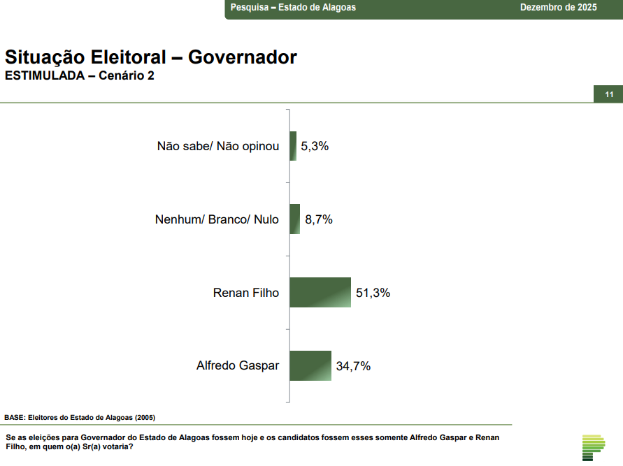 Forma ouvidas 2005 pessoas, em 64 municípios, entre os dias 4 e 8 de dezembro. Segundo o Instituto Paraná, “tal amostra representativa do Estado de Alagoas atinge um grau de confiança de 95% para uma margem estimada de erro de aproximadamente 2,2 pontos percentuais para os resultados gerais”.